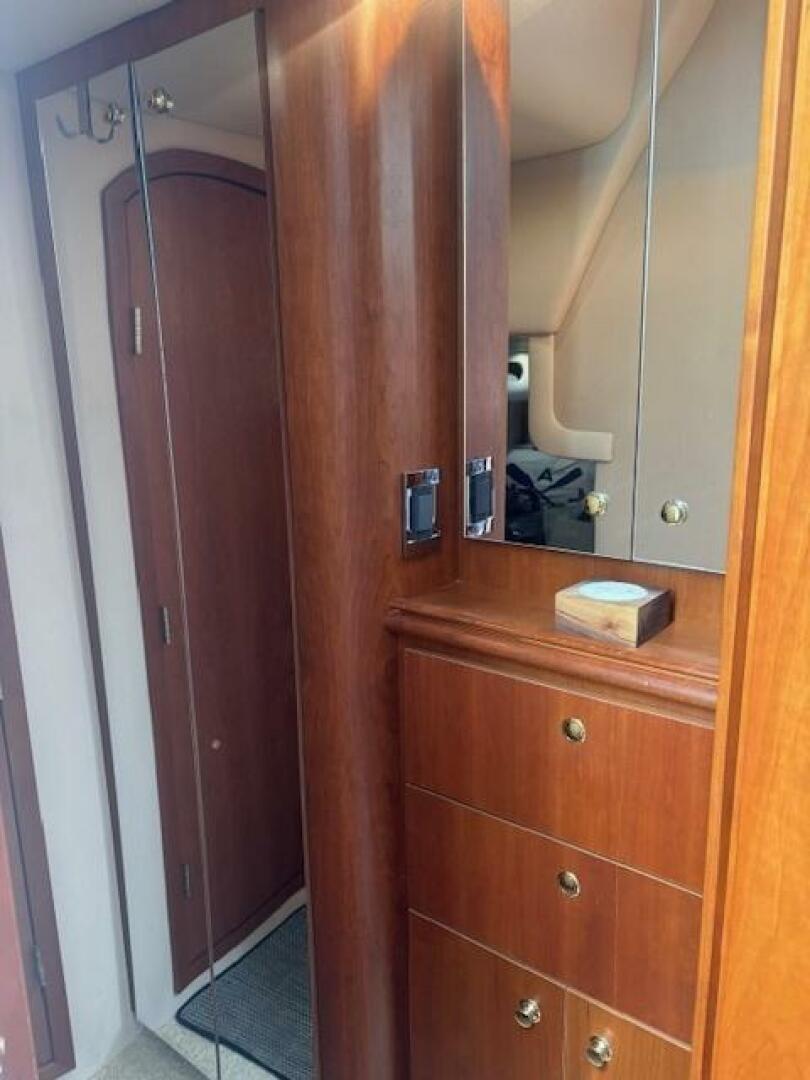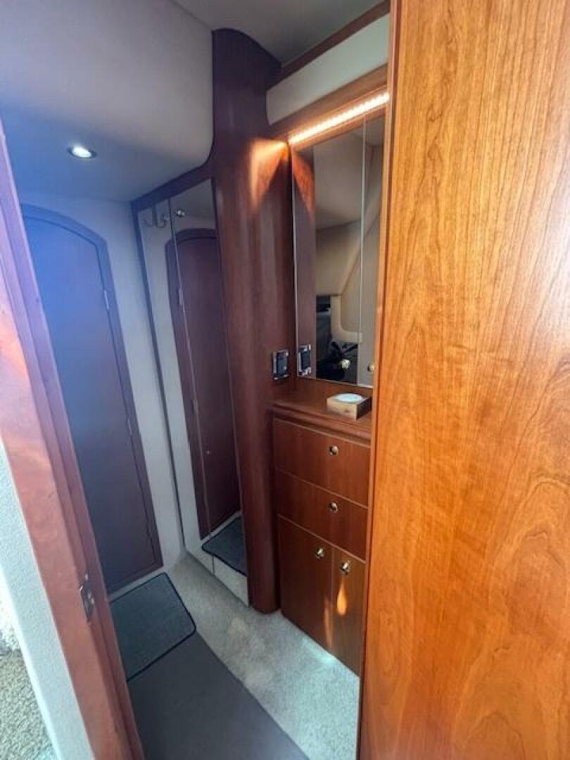 Recent work includes stripping the bottom to bare, applying a new barrier coat, and finishing with fresh antifouling paint. Power comes from a pair of MerCruiser 8.1S HO engines with around 850 hours, fresh-water cooled. The current owners have kept the boat in regular use and maintained it well.