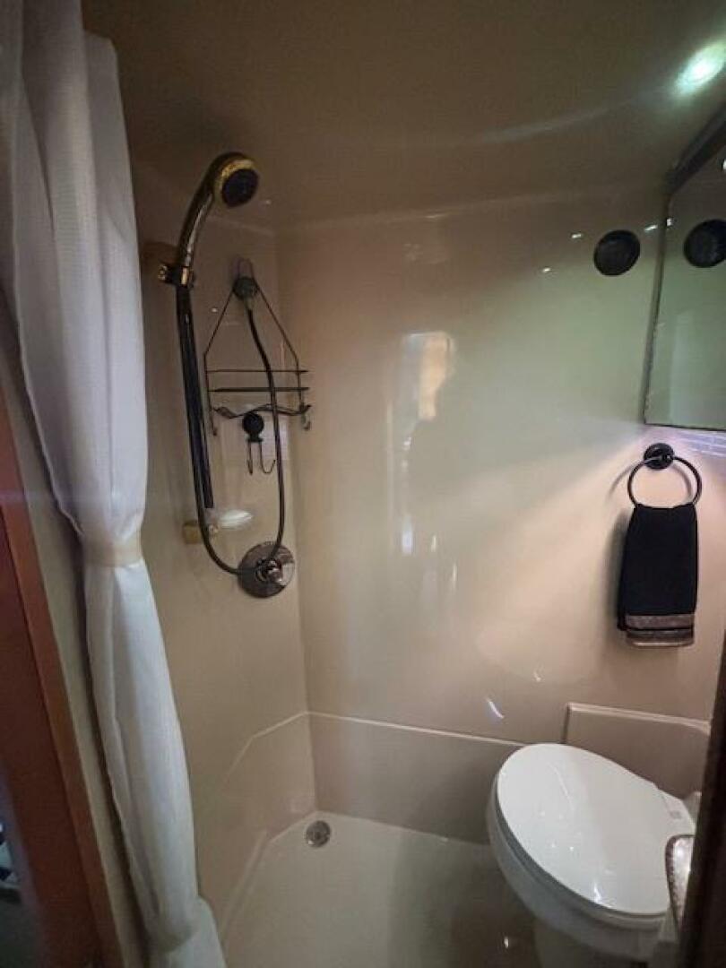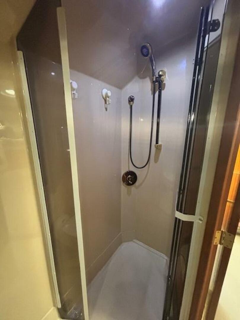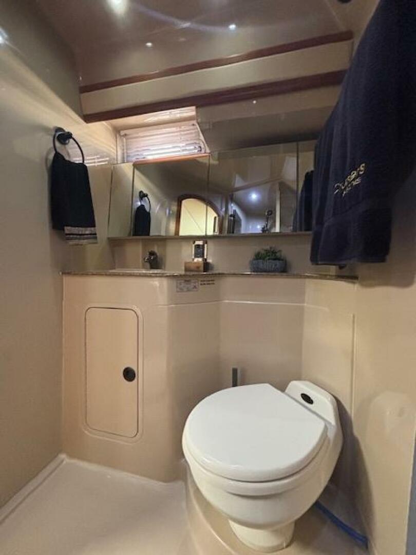 One of the standout features is the two-stateroom, two-head layout. The forward cabin has an island berth, while the mid-cabin converts from twin berths to a king. Each cabin has private access to its own head with a separate shower.