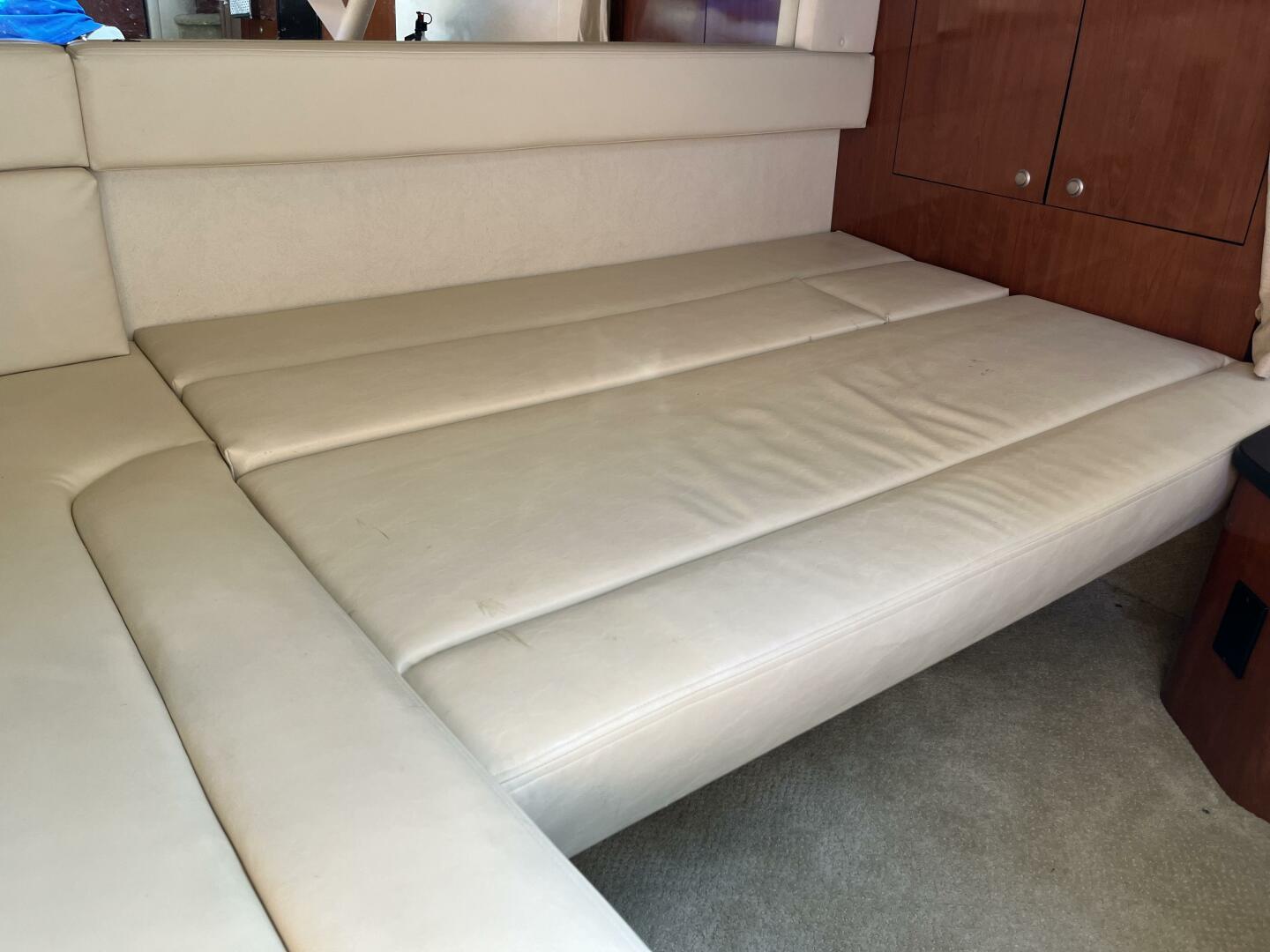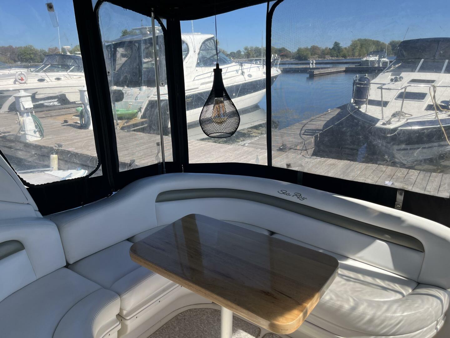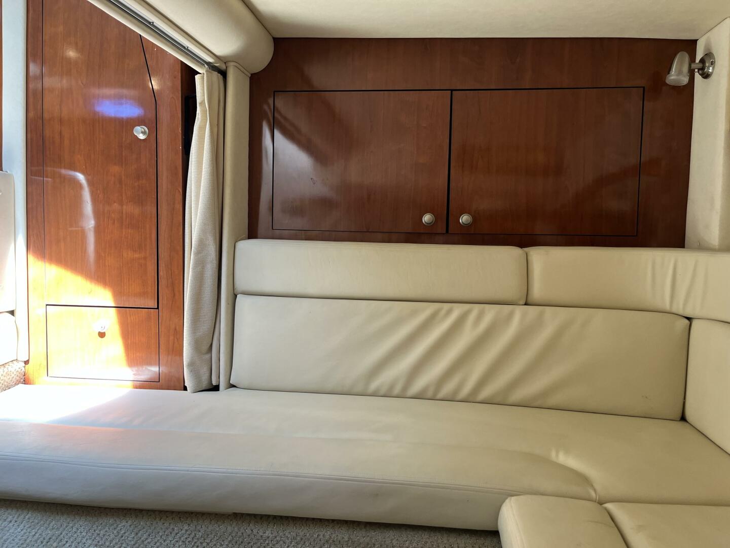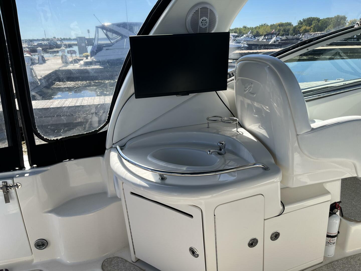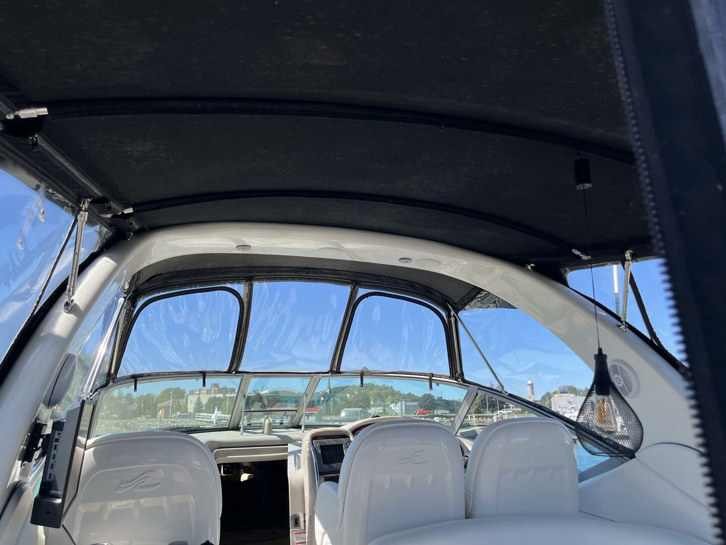 Step aboard the non-slip spacious swim platform and you can enter the spacious cockpit & lounge area. You will find a large U-shaped sofa with table, hanging light above the table, wet bar with fridge/freezer, TV, and carpeting all set behind the Helm. The Helm area features a double Captain seat for Captain & Co-Captain/Captain-In-Training and a separate third seat on Port-side. The Helm is equipped with a Garmin GPS, Raymarine Chart Plotter, a new VHF Radio, Audio Controls, Bow Thruster Control, and all the controls you need to get to where you are going safely and confidently. The canvas covering this entire area is in excellent condition. It has some screened windows for a breeze without bugs.