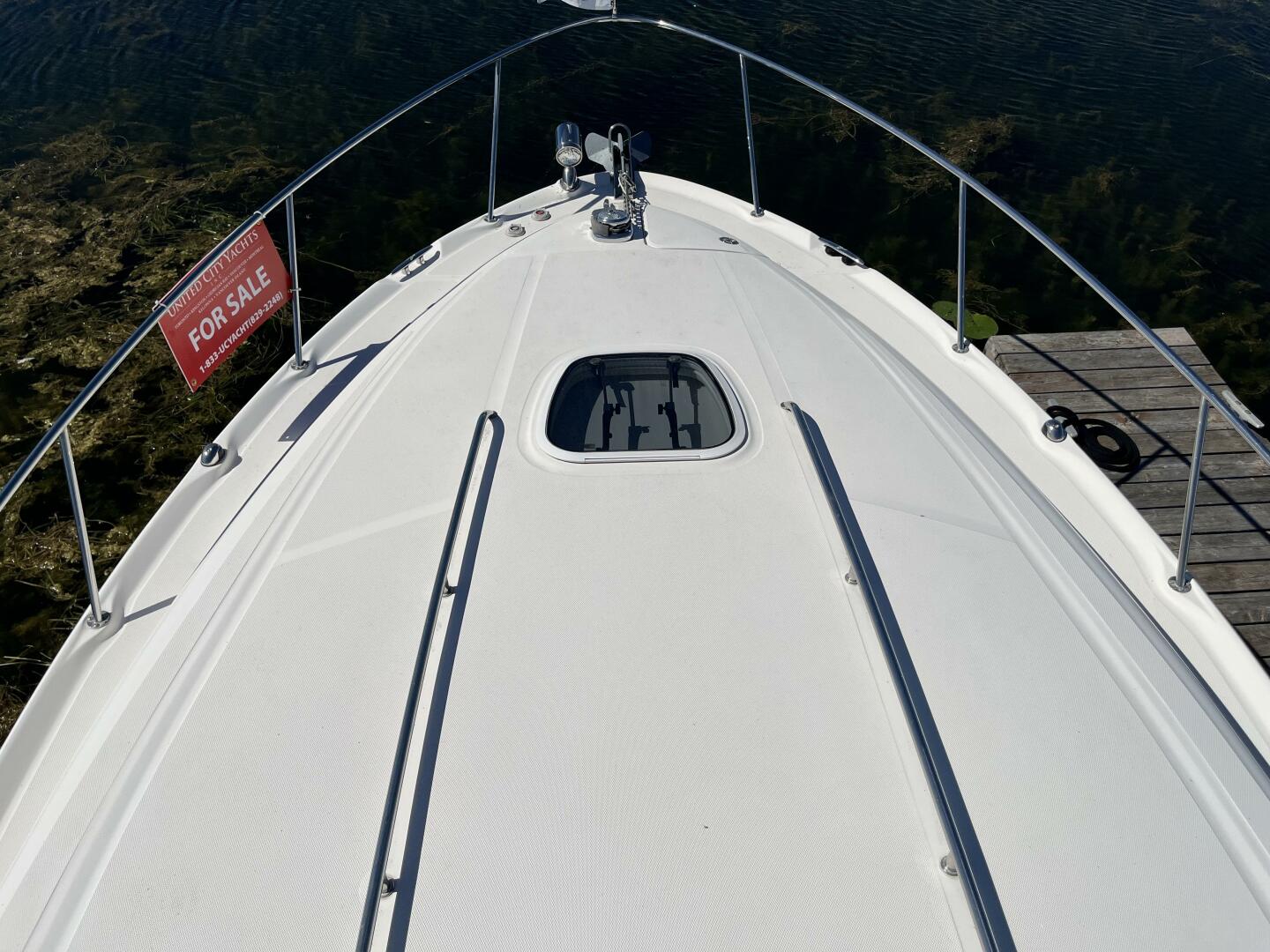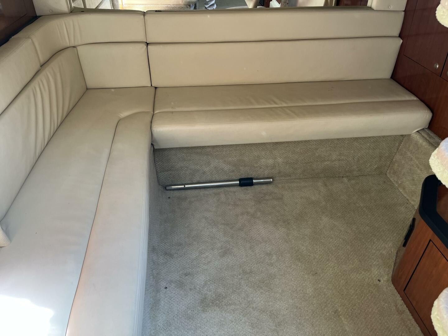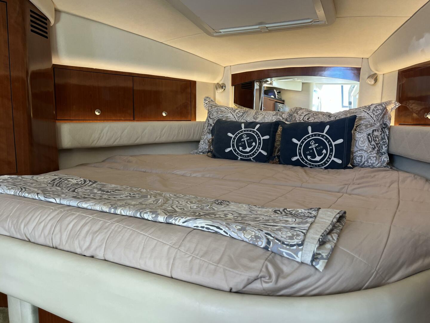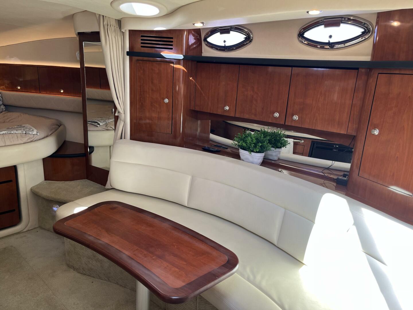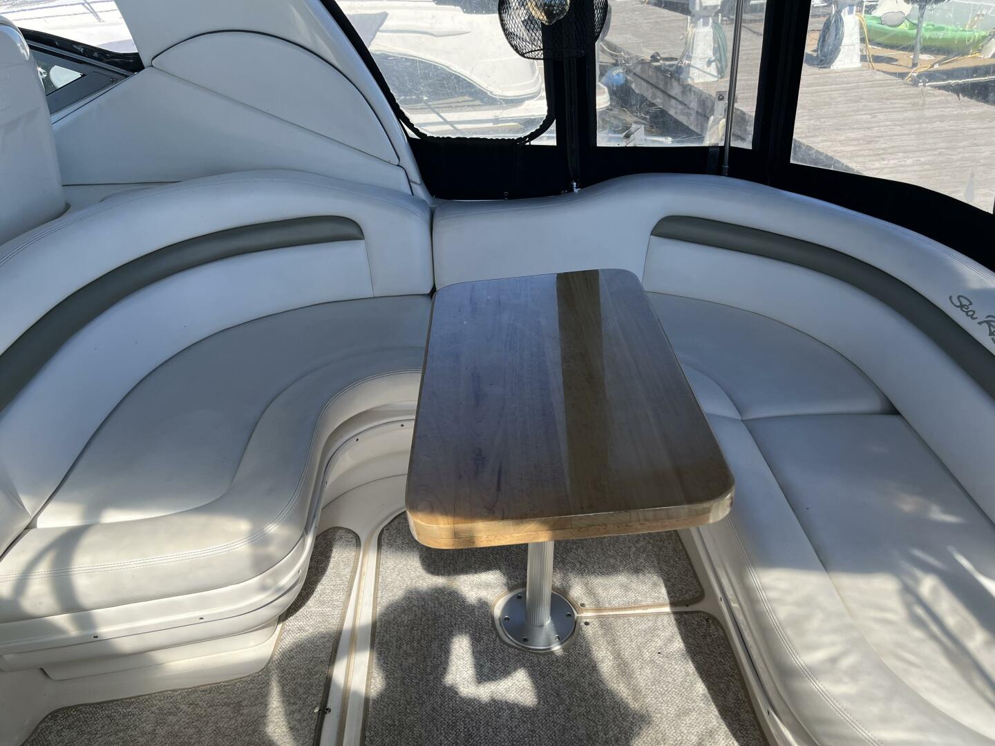 Step aboard the non-slip spacious swim platform and you can enter the spacious cockpit & lounge area. You will find a large U-shaped sofa with table, hanging light above the table, wet bar with fridge/freezer, TV, and carpeting all set behind the Helm. The Helm area features a double Captain seat for Captain & Co-Captain/Captain-In-Training and a separate third seat on Port-side. The Helm is equipped with a Garmin GPS, Raymarine Chart Plotter, a new VHF Radio, Audio Controls, Bow Thruster Control, and all the controls you need to get to where you are going safely and confidently. The canvas covering this entire area is in excellent condition. It has some screened windows for a breeze without bugs.