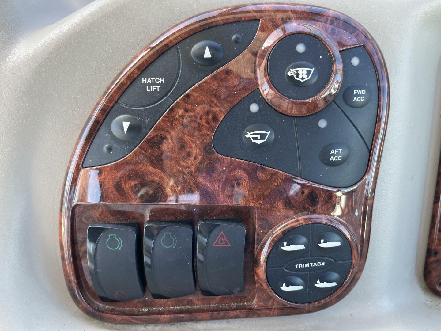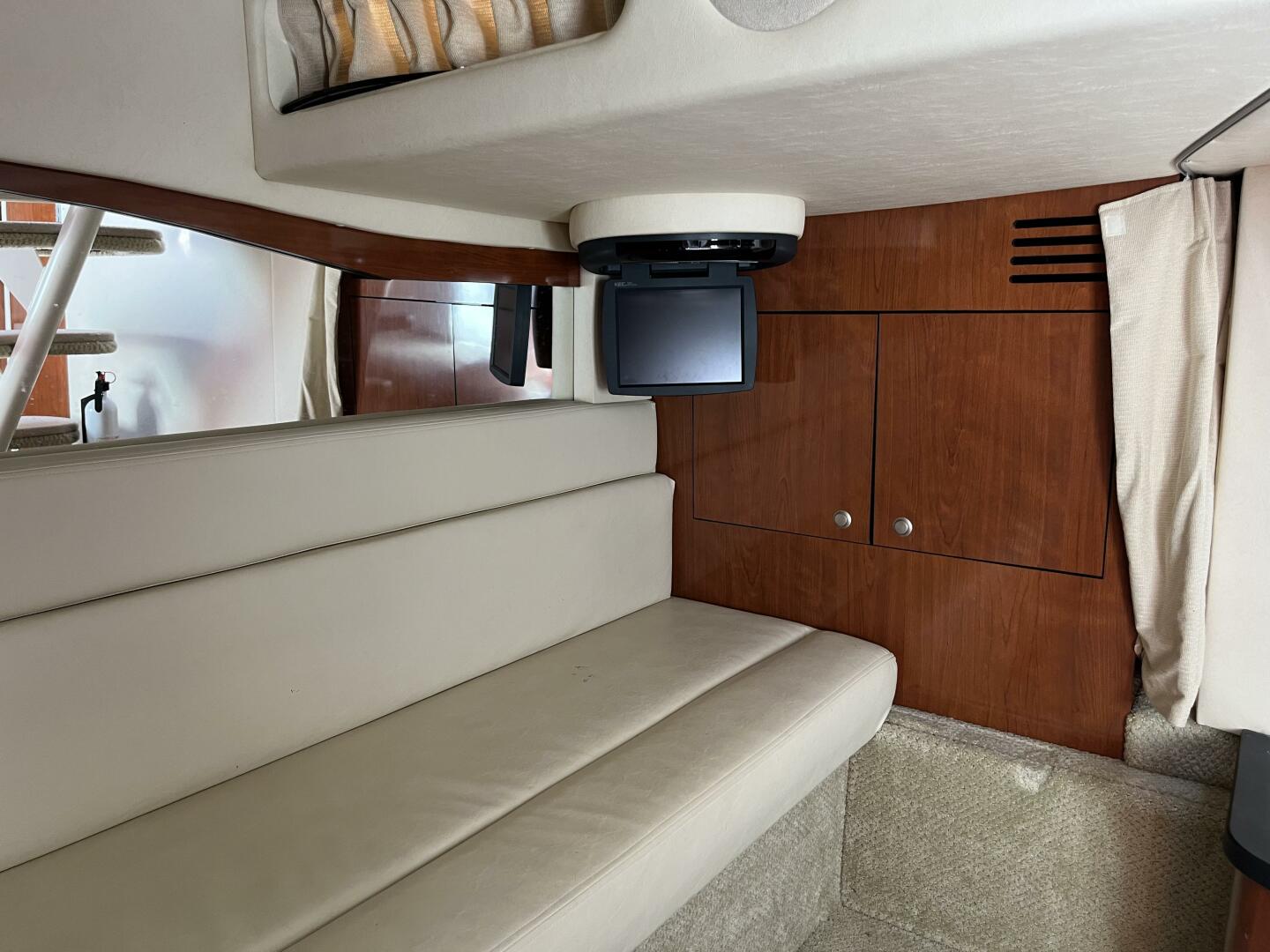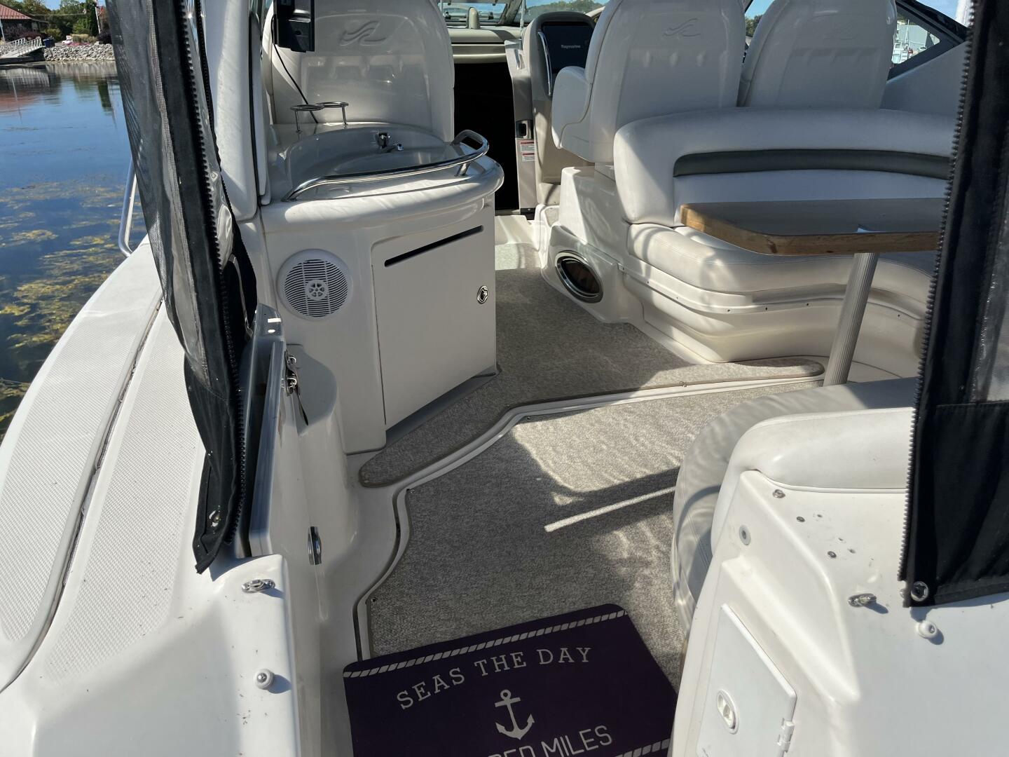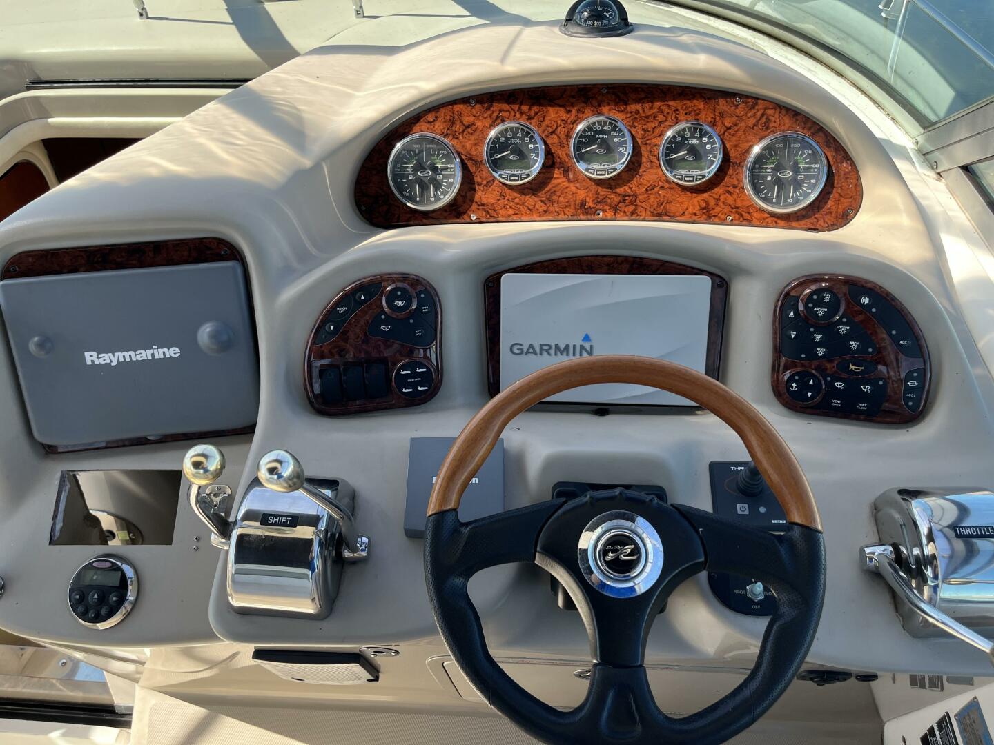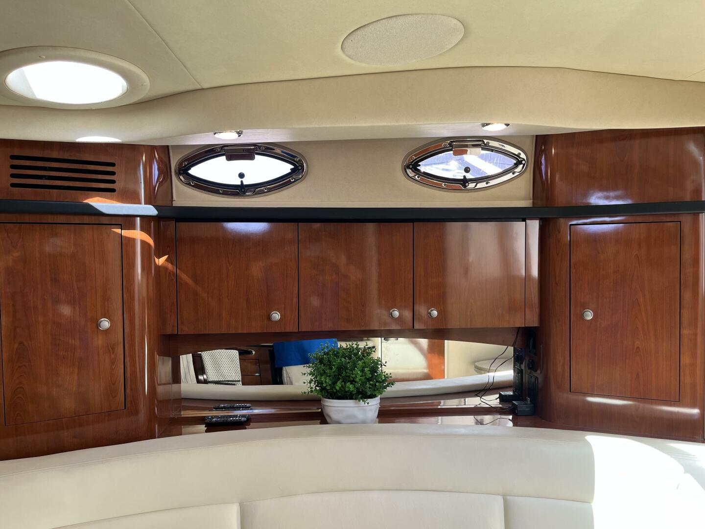 Step aboard the non-slip spacious swim platform and you can enter the spacious cockpit & lounge area. You will find a large U-shaped sofa with table, hanging light above the table, wet bar with fridge/freezer, TV, and carpeting all set behind the Helm. The Helm area features a double Captain seat for Captain & Co-Captain/Captain-In-Training and a separate third seat on Port-side. The Helm is equipped with a Garmin GPS, Raymarine Chart Plotter, a new VHF Radio, Audio Controls, Bow Thruster Control, and all the controls you need to get to where you are going safely and confidently. The canvas covering this entire area is in excellent condition. It has some screened windows for a breeze without bugs.