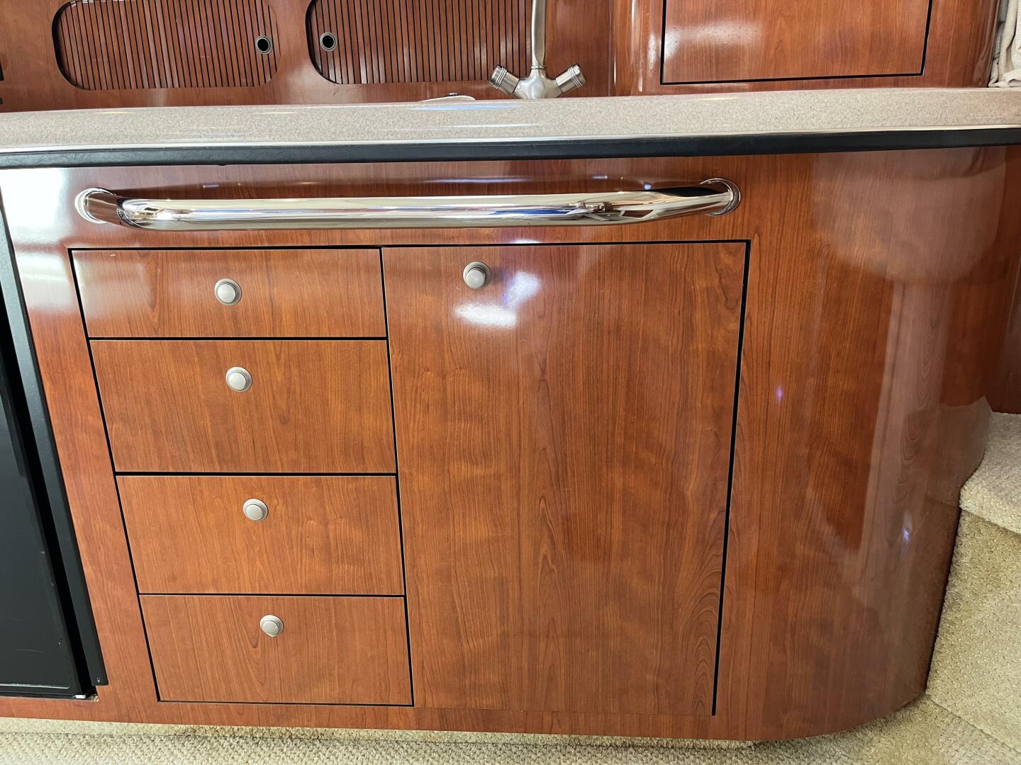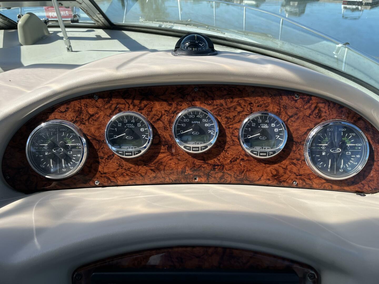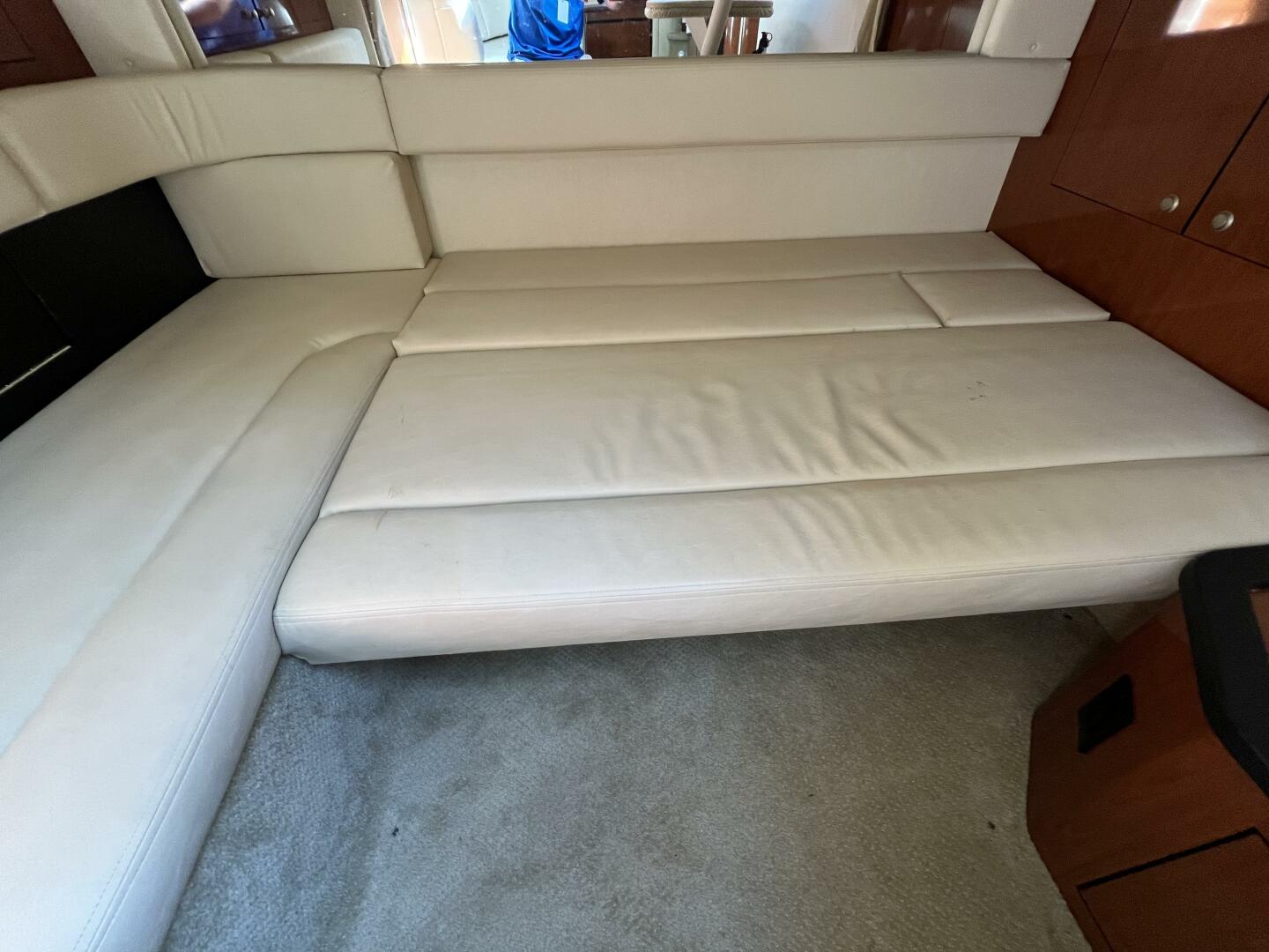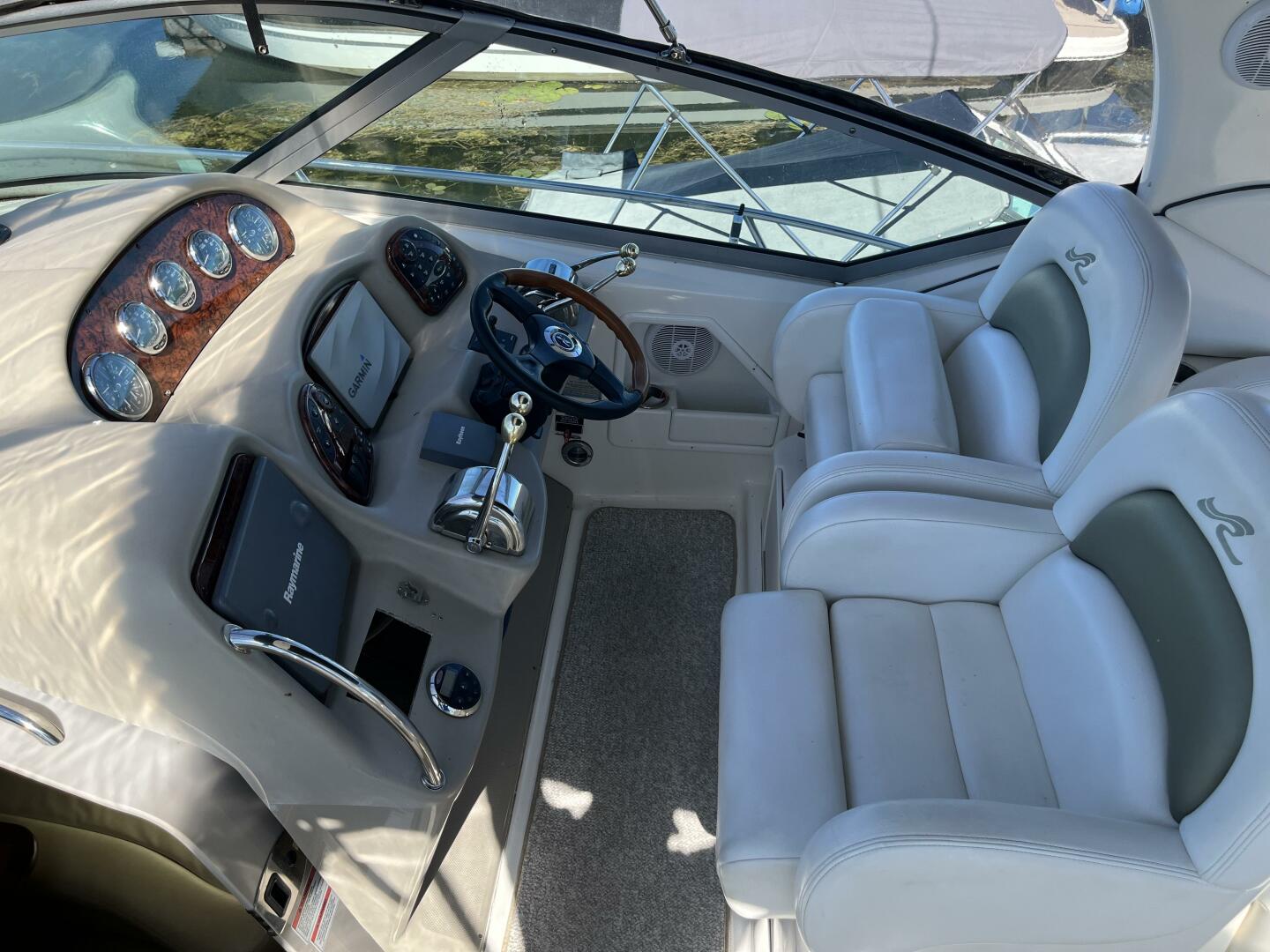 Step aboard the non-slip spacious swim platform and you can enter the spacious cockpit & lounge area. You will find a large U-shaped sofa with table, hanging light above the table, wet bar with fridge/freezer, TV, and carpeting all set behind the Helm. The Helm area features a double Captain seat for Captain & Co-Captain/Captain-In-Training and a separate third seat on Port-side. The Helm is equipped with a Garmin GPS, Raymarine Chart Plotter, a new VHF Radio, Audio Controls, Bow Thruster Control, and all the controls you need to get to where you are going safely and confidently. The canvas covering this entire area is in excellent condition. It has some screened windows for a breeze without bugs.