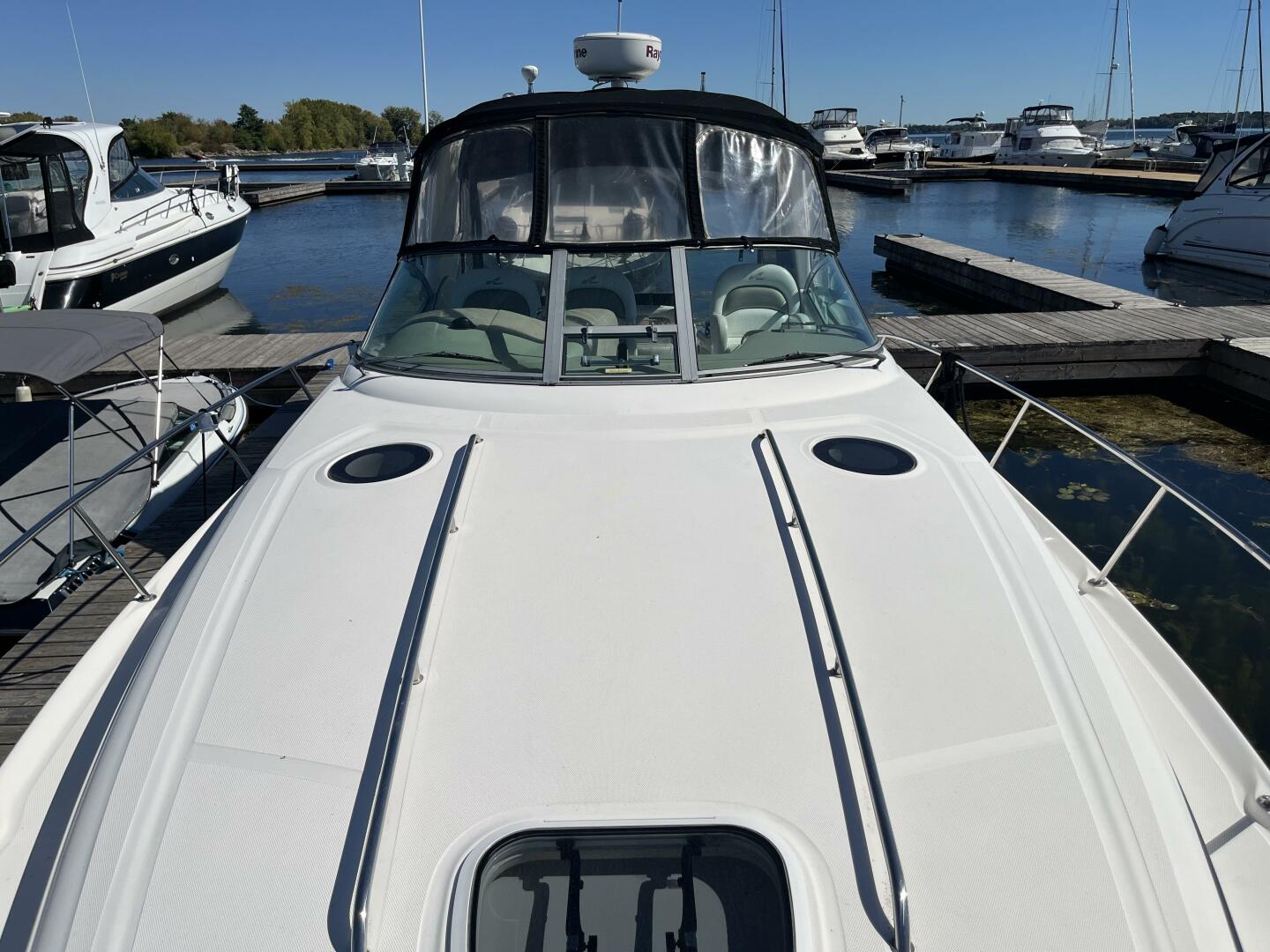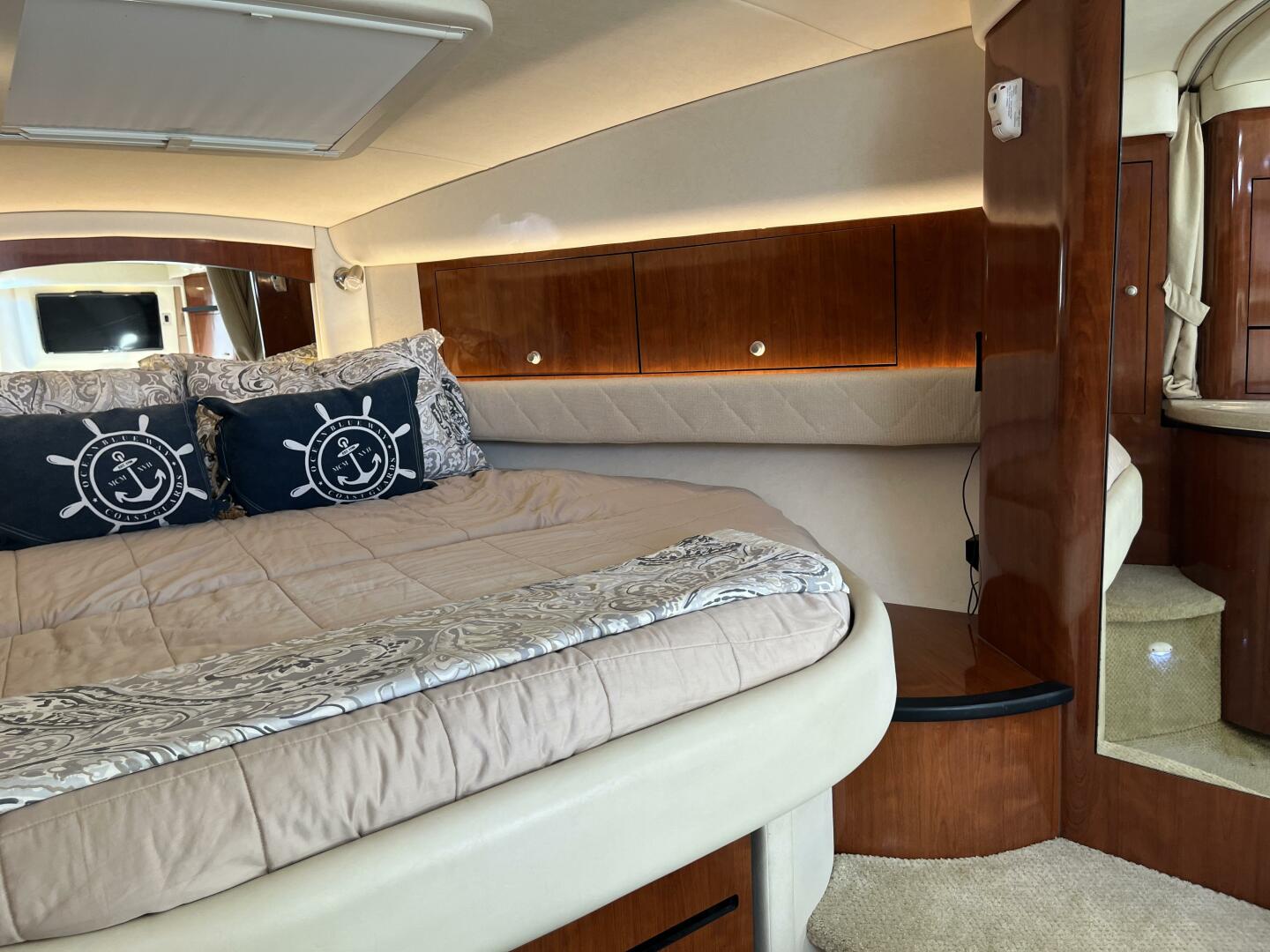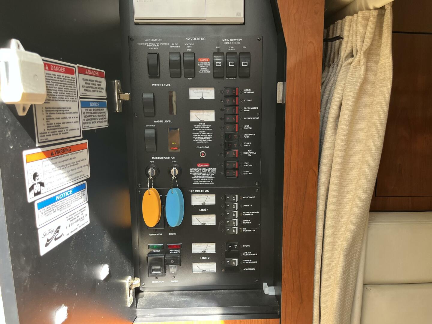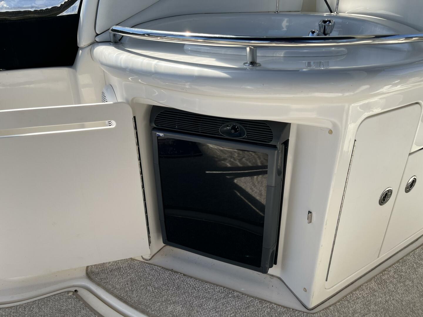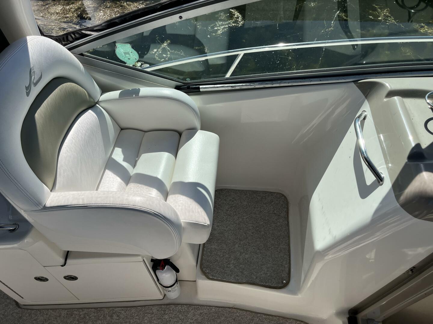 Step aboard the non-slip spacious swim platform and you can enter the spacious cockpit & lounge area. You will find a large U-shaped sofa with table, hanging light above the table, wet bar with fridge/freezer, TV, and carpeting all set behind the Helm. The Helm area features a double Captain seat for Captain & Co-Captain/Captain-In-Training and a separate third seat on Port-side. The Helm is equipped with a Garmin GPS, Raymarine Chart Plotter, a new VHF Radio, Audio Controls, Bow Thruster Control, and all the controls you need to get to where you are going safely and confidently. The canvas covering this entire area is in excellent condition. It has some screened windows for a breeze without bugs.