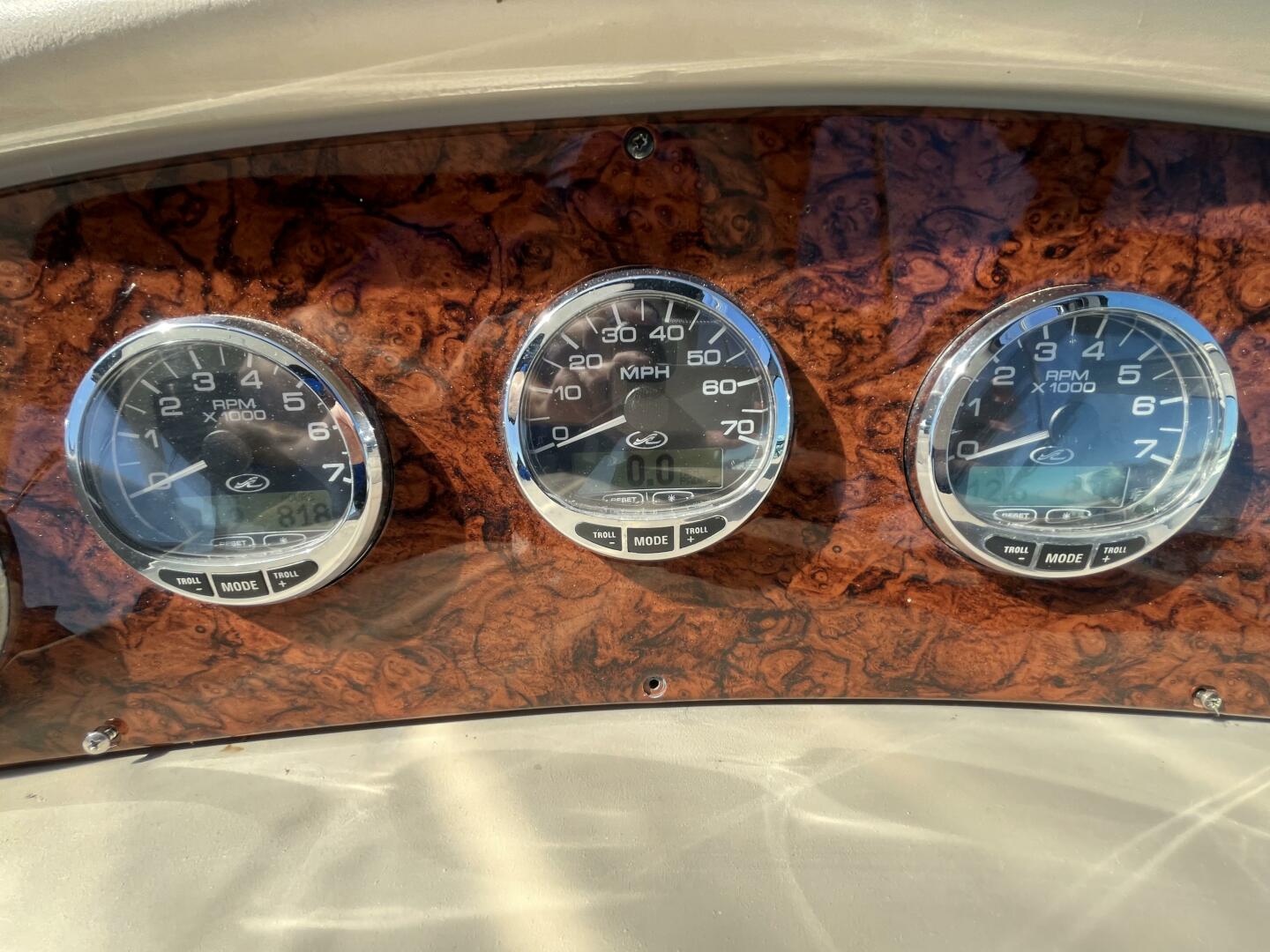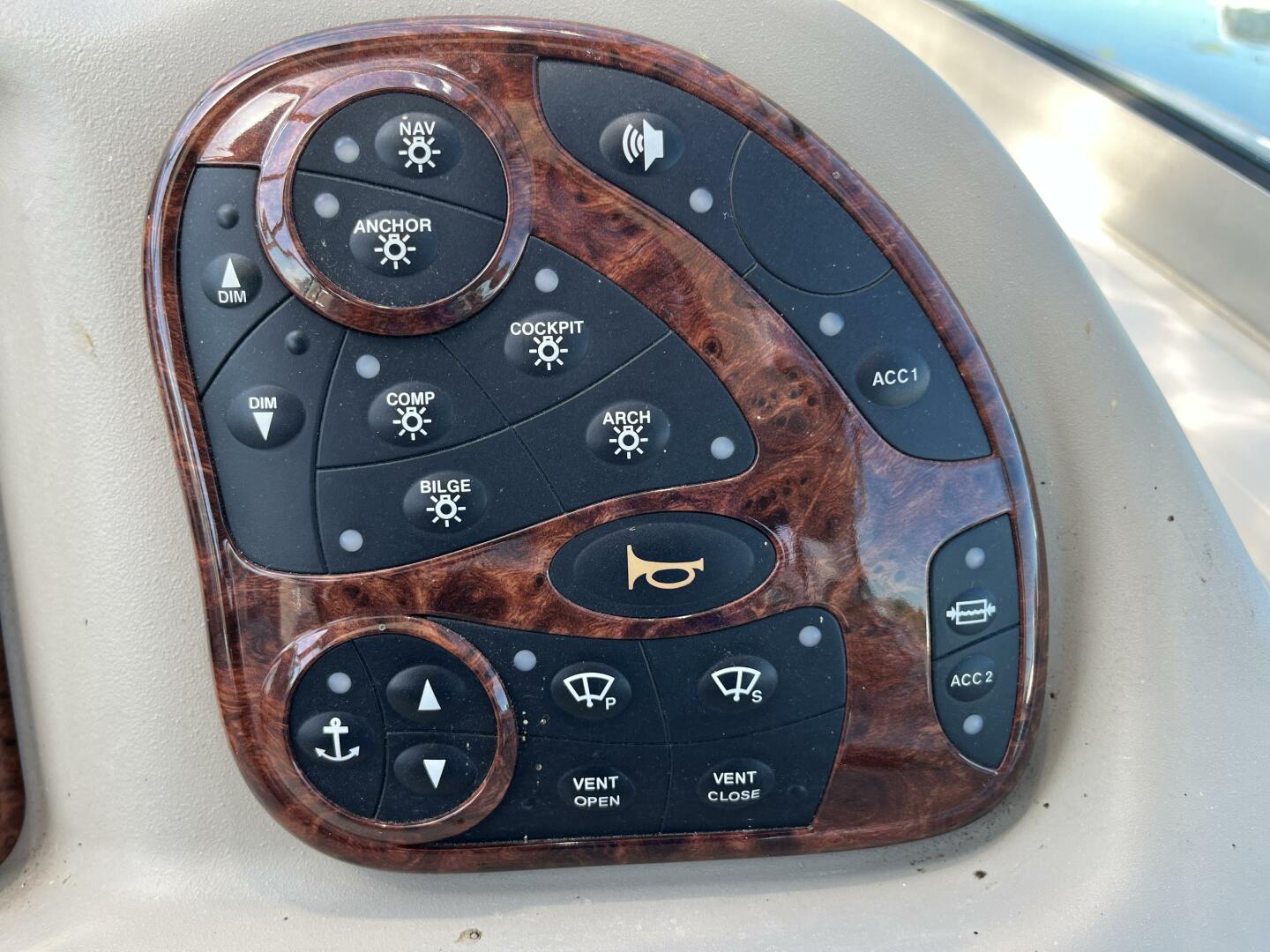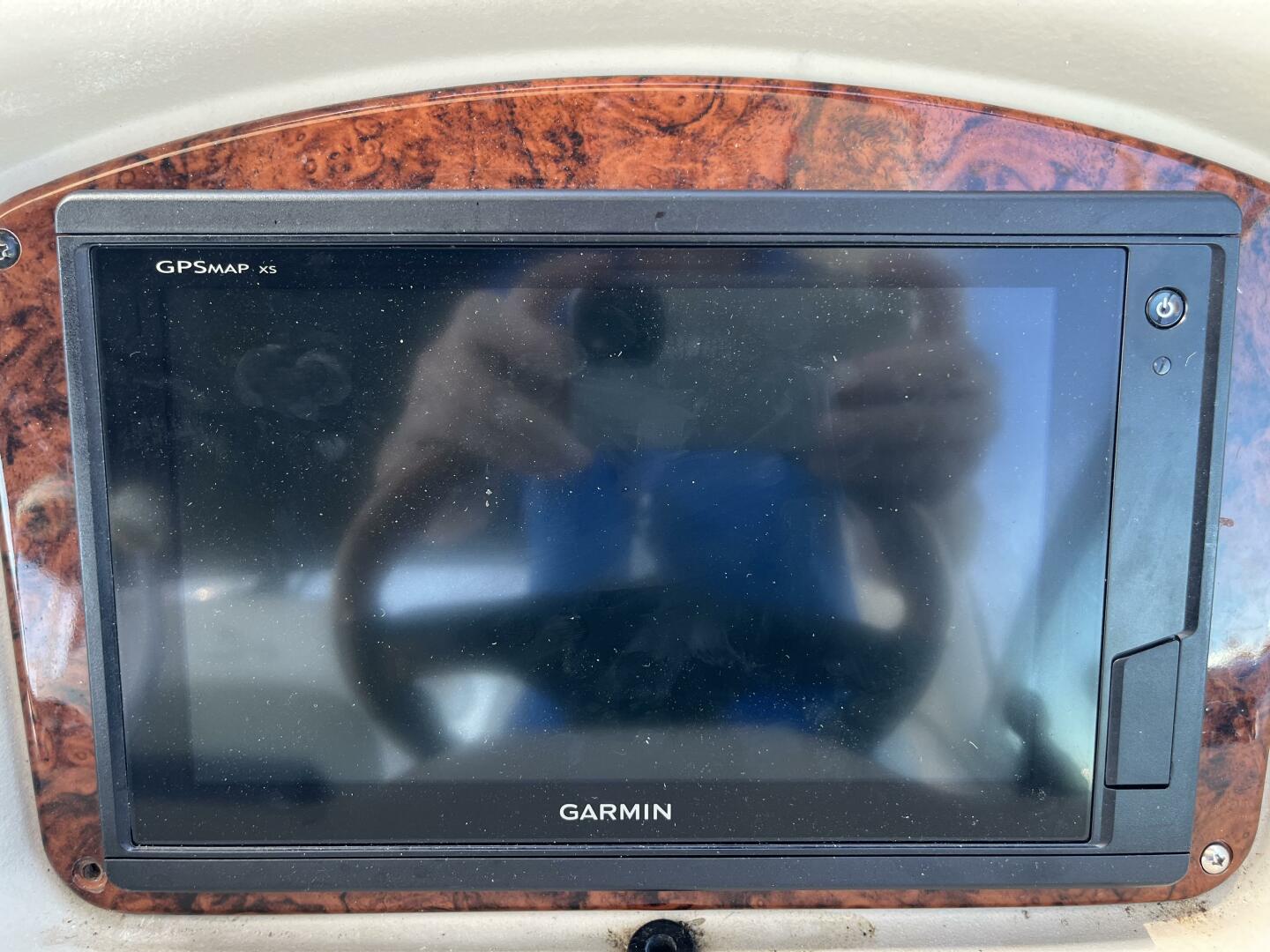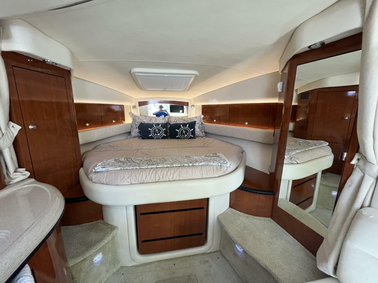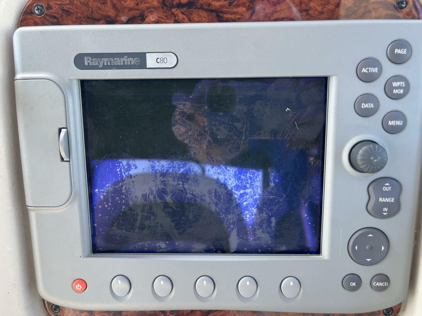 Step aboard the non-slip spacious swim platform and you can enter the spacious cockpit & lounge area. You will find a large U-shaped sofa with table, hanging light above the table, wet bar with fridge/freezer, TV, and carpeting all set behind the Helm. The Helm area features a double Captain seat for Captain & Co-Captain/Captain-In-Training and a separate third seat on Port-side. The Helm is equipped with a Garmin GPS, Raymarine Chart Plotter, a new VHF Radio, Audio Controls, Bow Thruster Control, and all the controls you need to get to where you are going safely and confidently. The canvas covering this entire area is in excellent condition. It has some screened windows for a breeze without bugs.