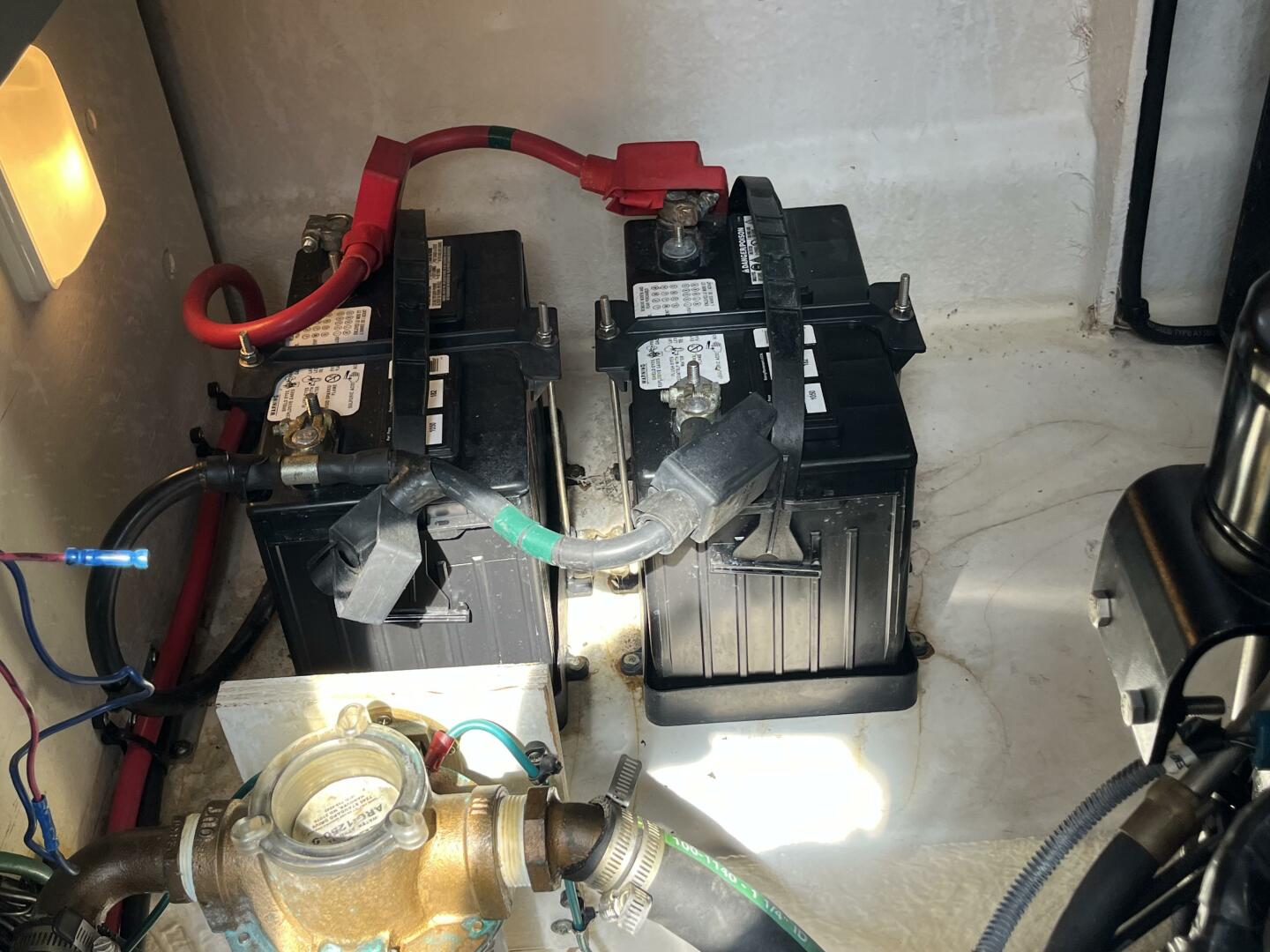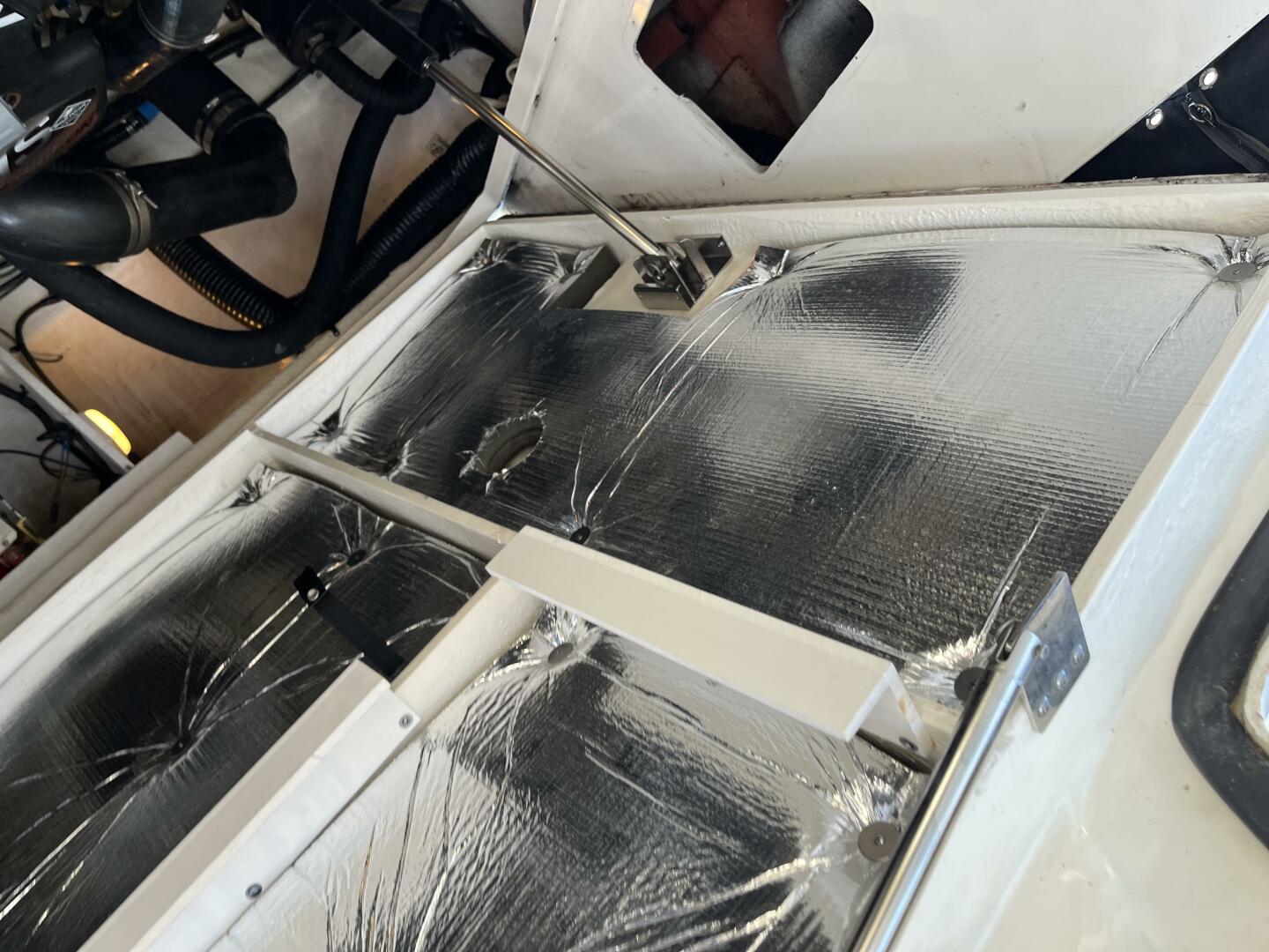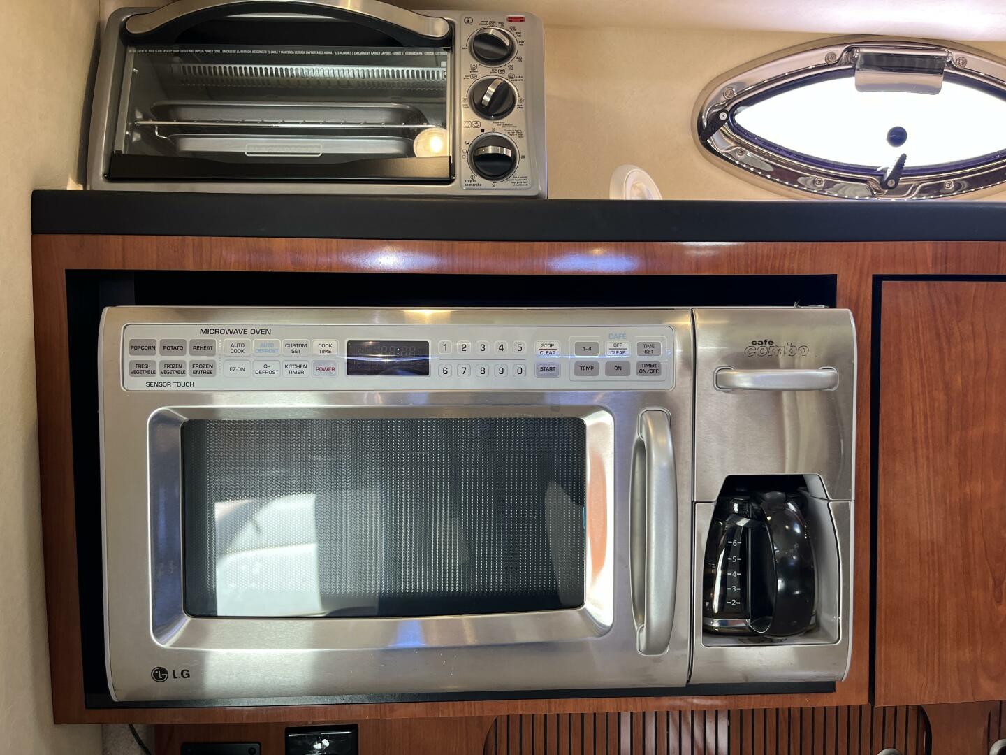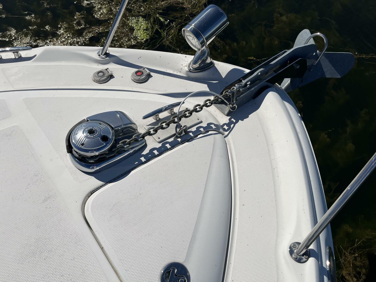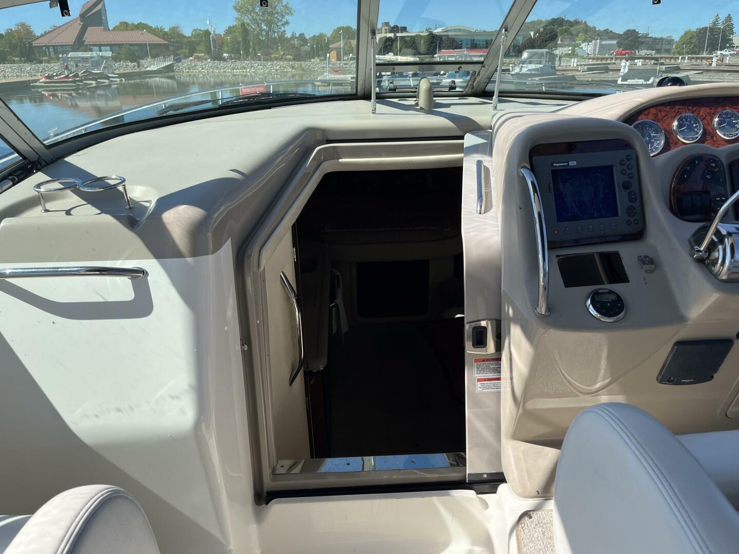 Step aboard the non-slip spacious swim platform and you can enter the spacious cockpit & lounge area. You will find a large U-shaped sofa with table, hanging light above the table, wet bar with fridge/freezer, TV, and carpeting all set behind the Helm. The Helm area features a double Captain seat for Captain & Co-Captain/Captain-In-Training and a separate third seat on Port-side. The Helm is equipped with a Garmin GPS, Raymarine Chart Plotter, a new VHF Radio, Audio Controls, Bow Thruster Control, and all the controls you need to get to where you are going safely and confidently. The canvas covering this entire area is in excellent condition. It has some screened windows for a breeze without bugs.