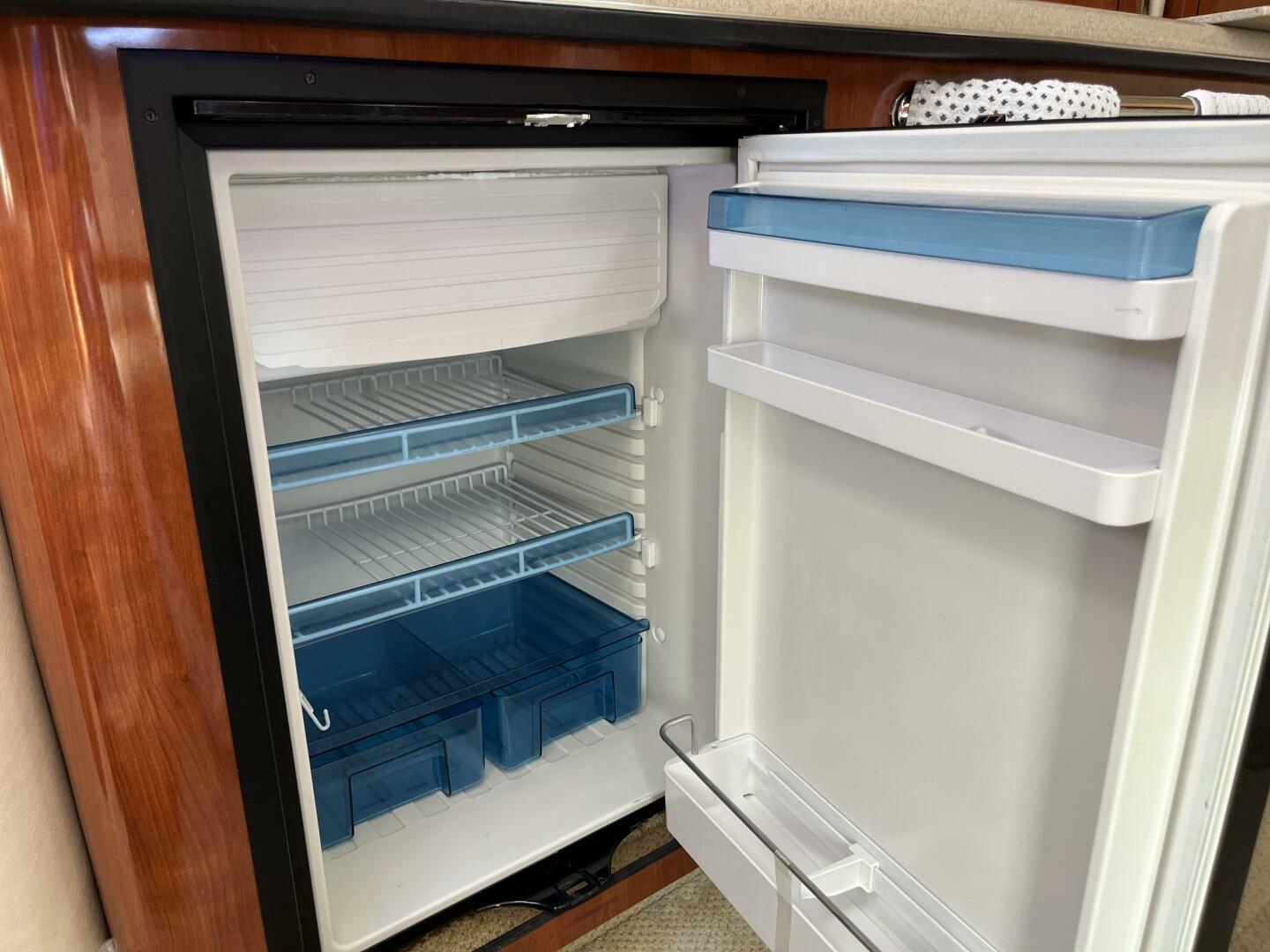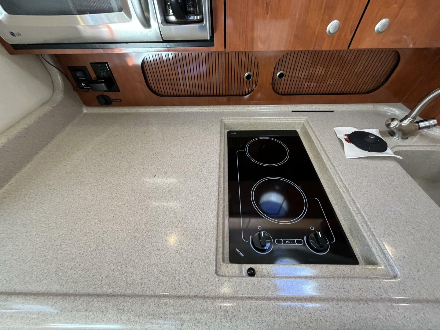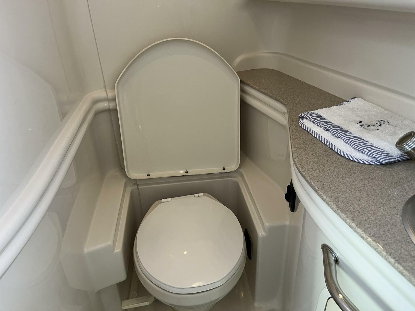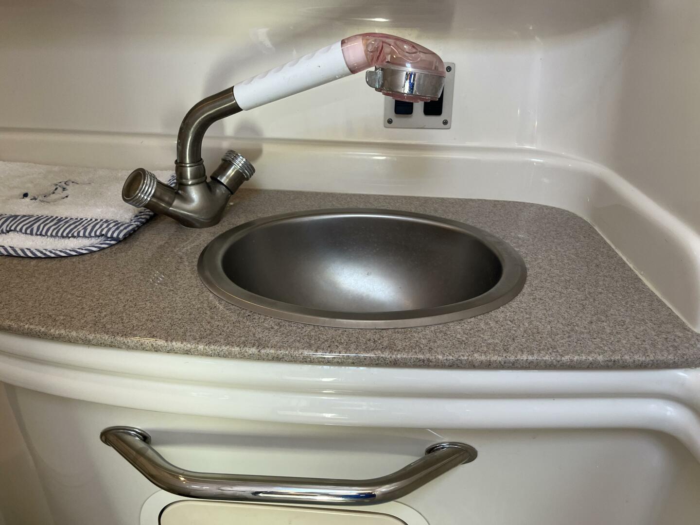 The spacious and elegant interior will certainly impress with all the amenities and comfort needed to stay aboard for long trips. There is plenty of Corian Counter space, a Fridge/Freezer combo, a 2-burner electric stove, a space-saving built-in microwave oven, a large sink, and lots of cupboards & drawers in the Galley. The Salon features a large convertible sofa with a dark solid-wood which matches the surrounding cabinetry and provides indoor dining space. There is also a flat-screen TV for entertainment options.