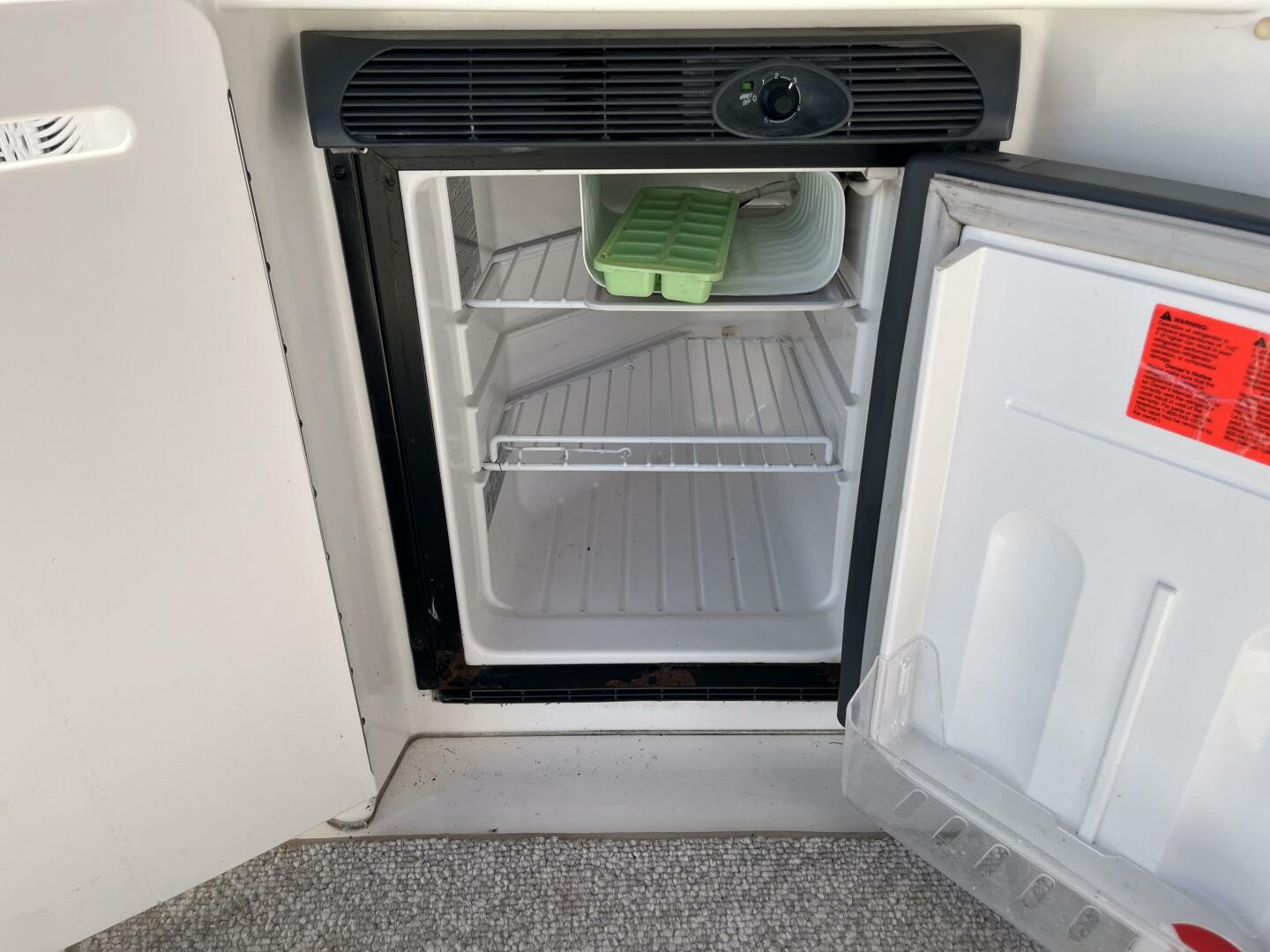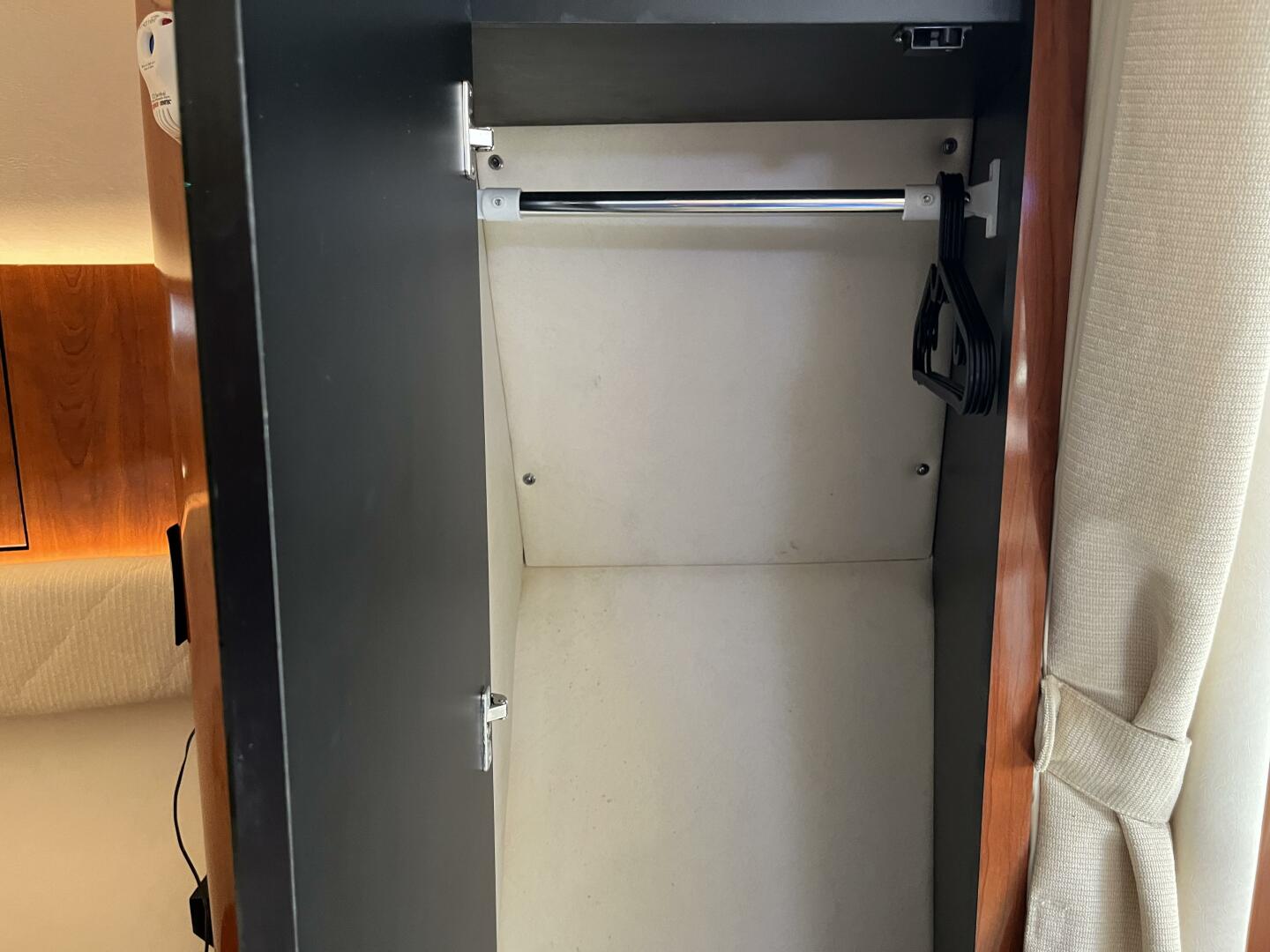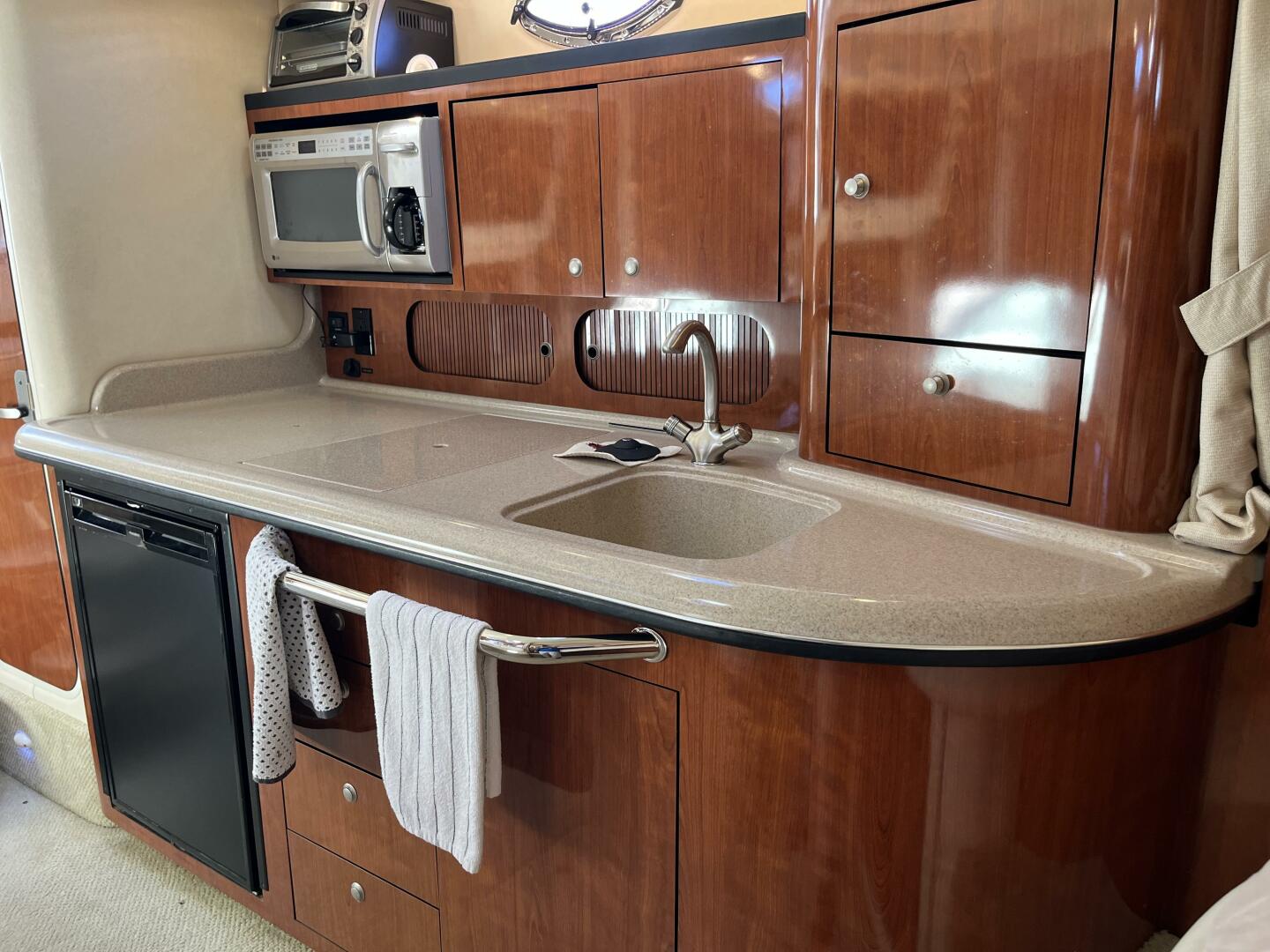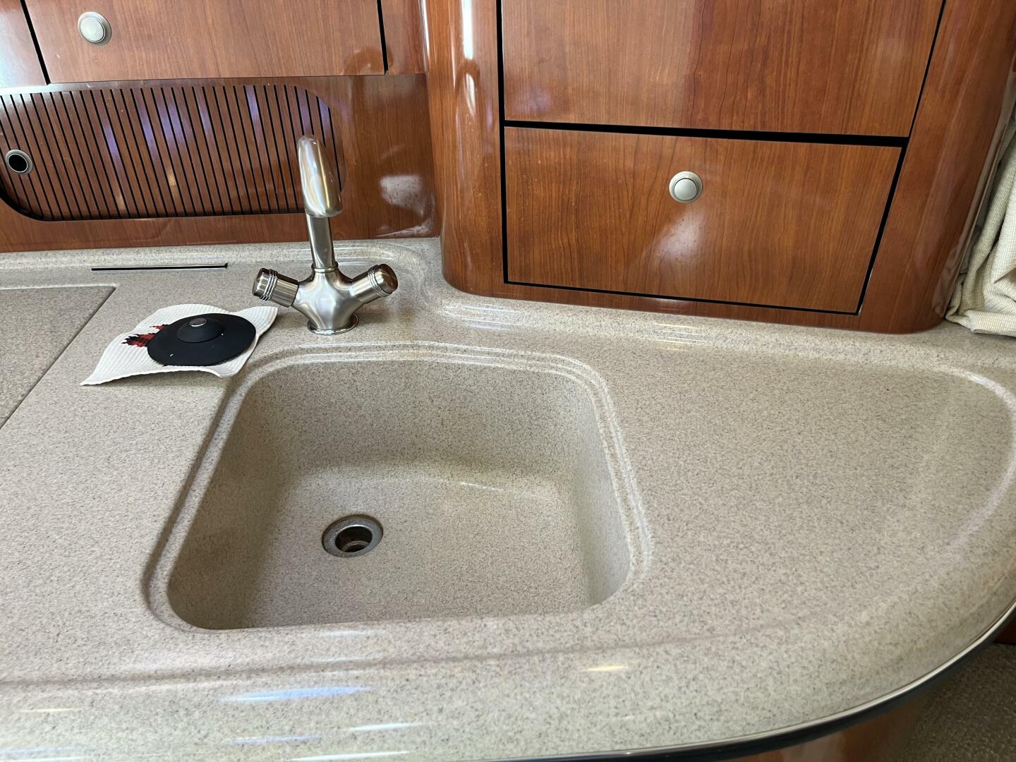 The spacious and elegant interior will certainly impress with all the amenities and comfort needed to stay aboard for long trips. There is plenty of Corian Counter space, a Fridge/Freezer combo, a 2-burner electric stove, a space-saving built-in microwave oven, a large sink, and lots of cupboards & drawers in the Galley. The Salon features a large convertible sofa with a dark solid-wood which matches the surrounding cabinetry and provides indoor dining space. There is also a flat-screen TV for entertainment options.