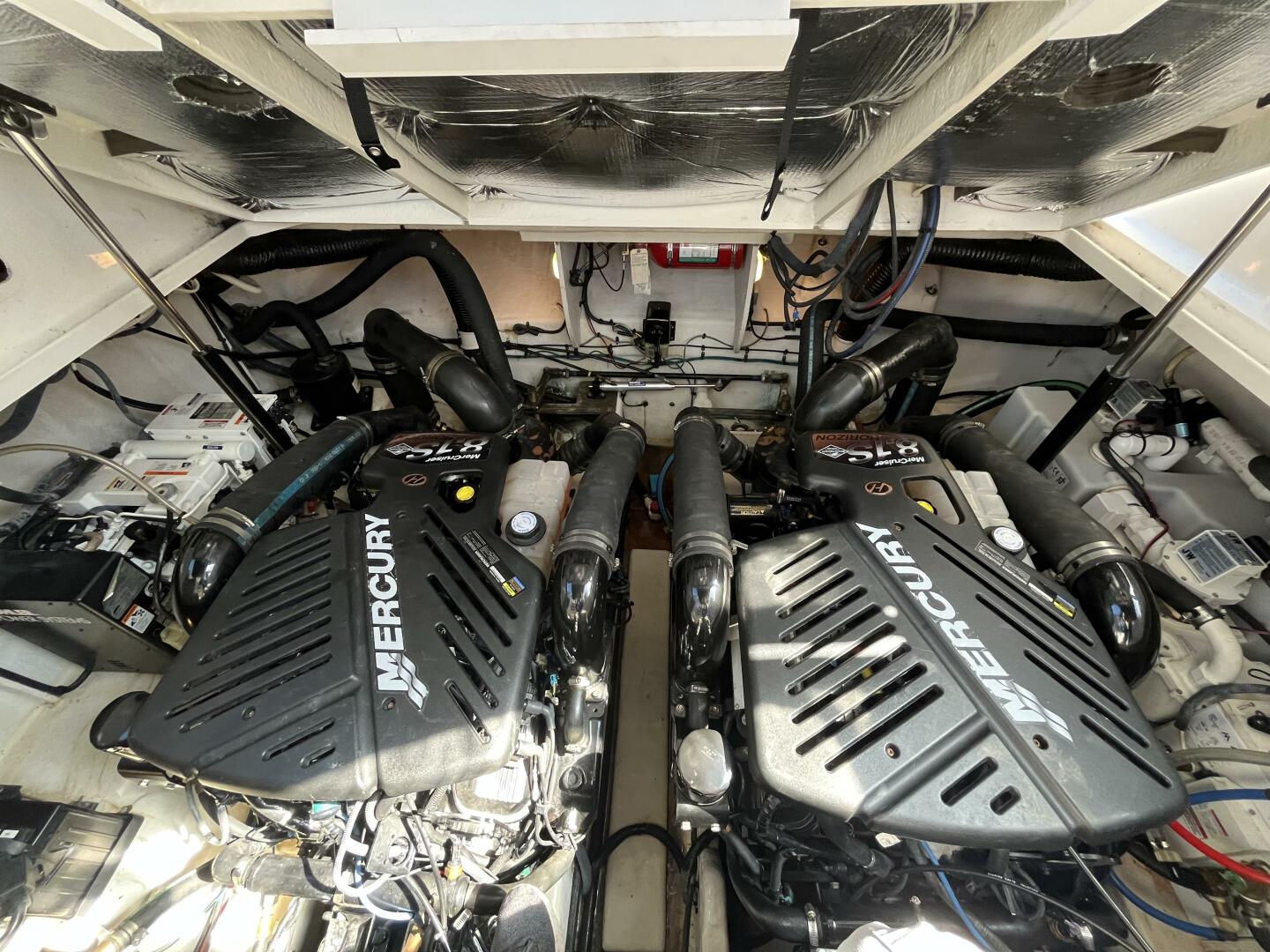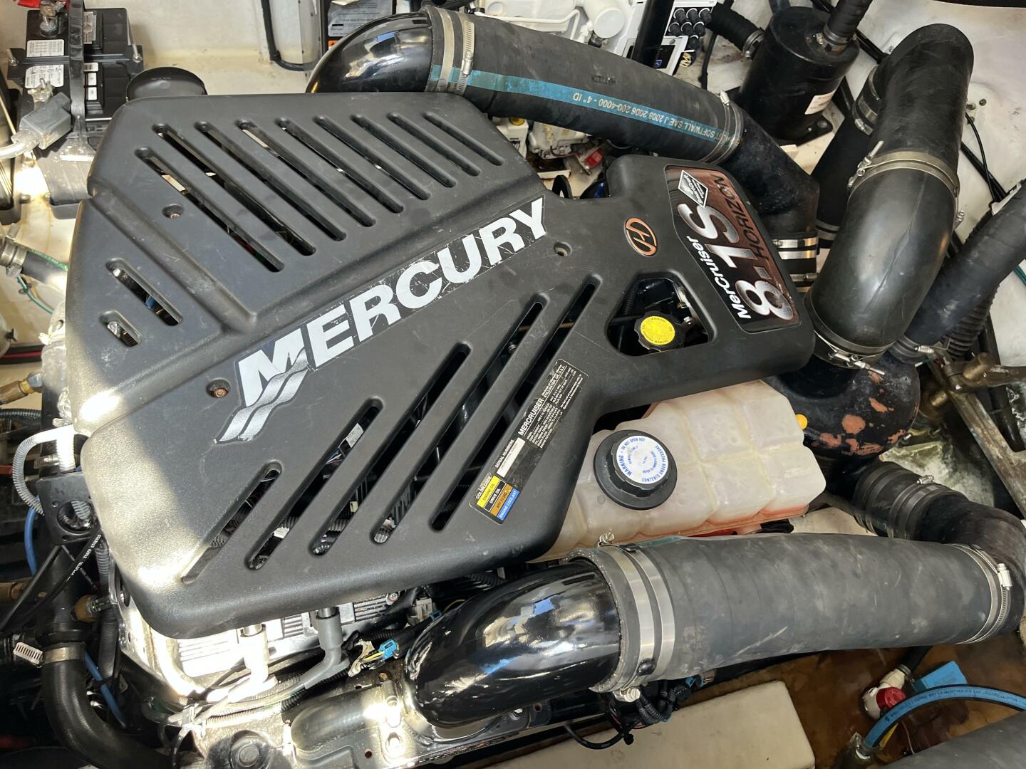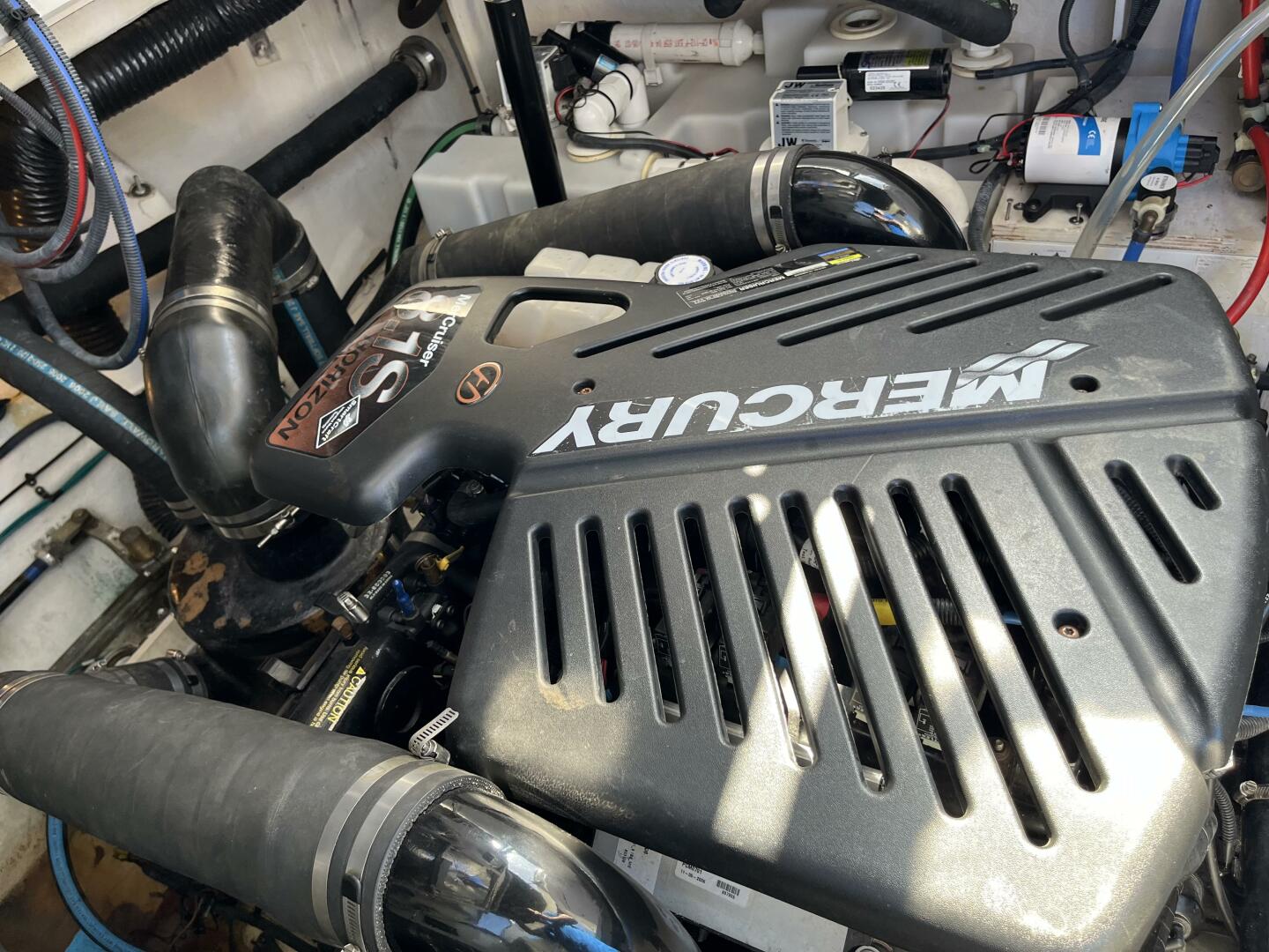 This Sundancer features a power lifting engine hatch providing access to the upgraded Twin MerCruiser Horizon 8.1L (496 cubic inch) gasoline engines with approximately 825 hours.